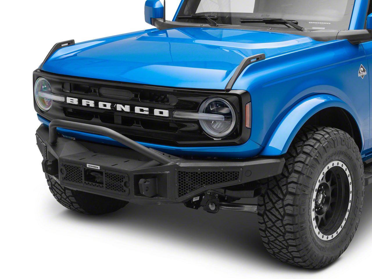 Application. The Go Rhino Rockline Winch-Ready Full Width Front Bumper with Over Rider fits 2021-2026 Bronco models, excluding Raptor.