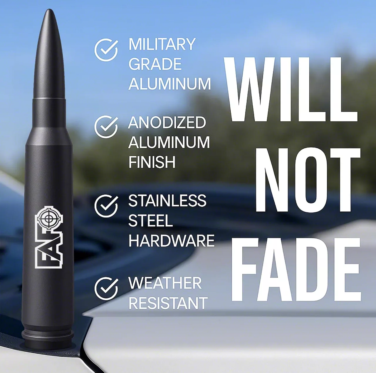 ADD ATTITUDE TO YOUR TRUCK – Ditch your long, boring factory antenna and give your truck the upgrade it deserves. The Badass Bullet Antenna is crafted to the exact dimensions of a real .50 caliber bullet, adding a bold, aggressive custom look that instantly transforms your ride’s appearance.