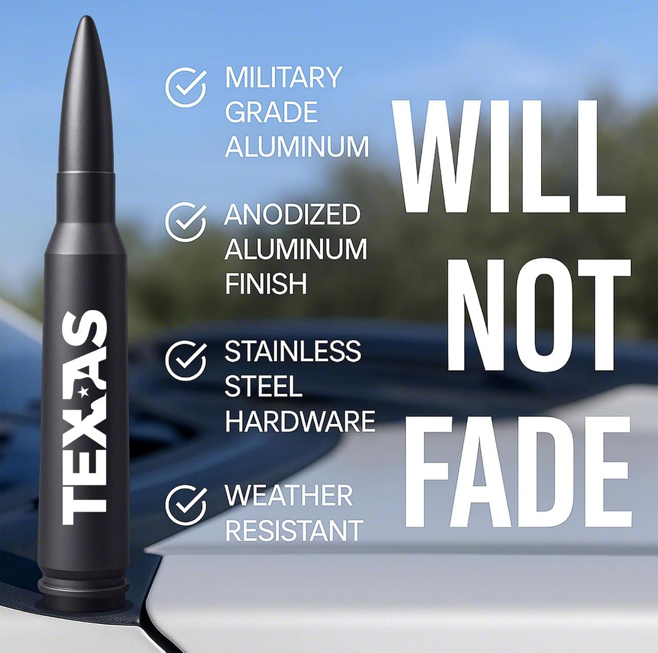 ADD ATTITUDE TO YOUR TRUCK – Ditch your long, boring factory antenna and give your truck the upgrade it deserves. The Badass Bullet Antenna is crafted to the exact dimensions of a real .50 caliber bullet, adding a bold, aggressive custom look that instantly transforms your ride’s appearance.