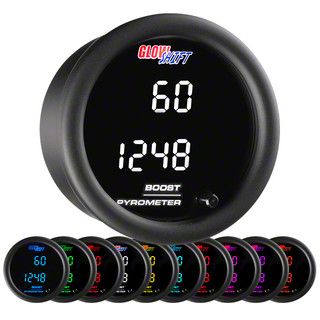 GlowShift 10 Color Digital Series Dual 60 PSI Boost & Pyrometer EGT Gauges monitor two key readings simultaneously. View boost pressure readings from 0 to 60 PSI, and Exhaust Gas Temperature readouts from 200° to 2200° Fahrenheit. This boost and EGT gauge kit is electronically driven and features customizable displays with bold, easy to read, quick glance digital numerical readouts. Each combination boost and egt gauge includes Sensors, Wiring Kits and more for installation.