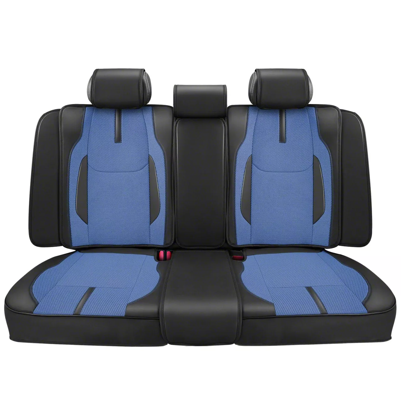 Construction and Appearance. Made from durable, water-resistant fabric, the covers feature UV-resistant material that prevents fading from sun exposure. The two-tone dark blue and black styling adds a modern, sporty look to your interior, while double-stitched seams ensure long-lasting strength. Adjustable straps keep the covers securely in place, and the design is compatible with side airbags for safety.