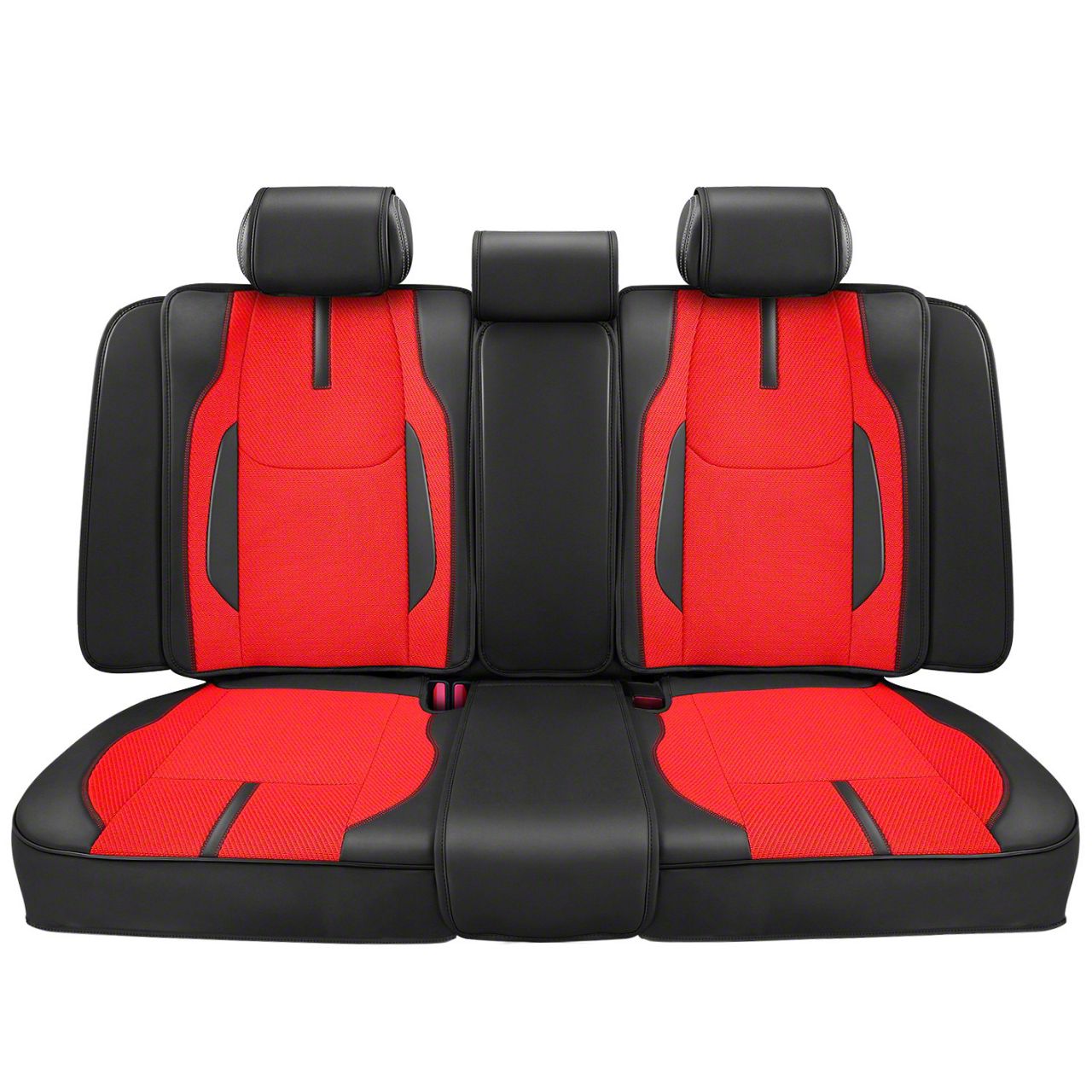 Protective Interior Upgrade. The Drive Series Front and Rear Seat Covers provide a durable and stylish way to safeguard your vehicle's interior from daily wear and tear. Designed with foam lining for added comfort, these covers help preserve the factory seats while enhancing the cabin's appearance with bold red and black styling.