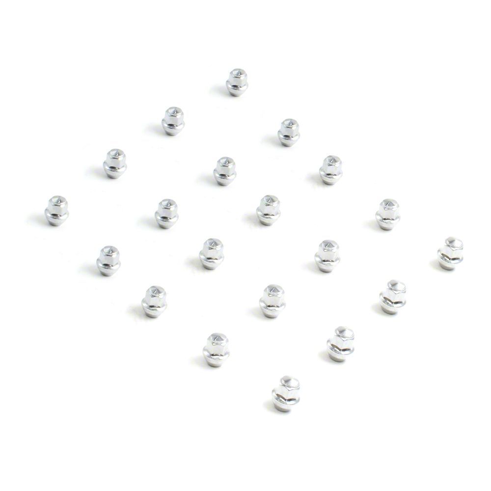 OEM Style Lug Nuts. The Factory Style Chrome Acorn Lug Nut Kit; 3/4-Inch; Set of 20 provides a complete set of replacement lug nuts that match factory specifications exactly. Designed to secure wheels safely and maintain the aesthetic of your vehicle, these lug nuts are essential for maintenance tasks like tire rotations and wheel replacements.