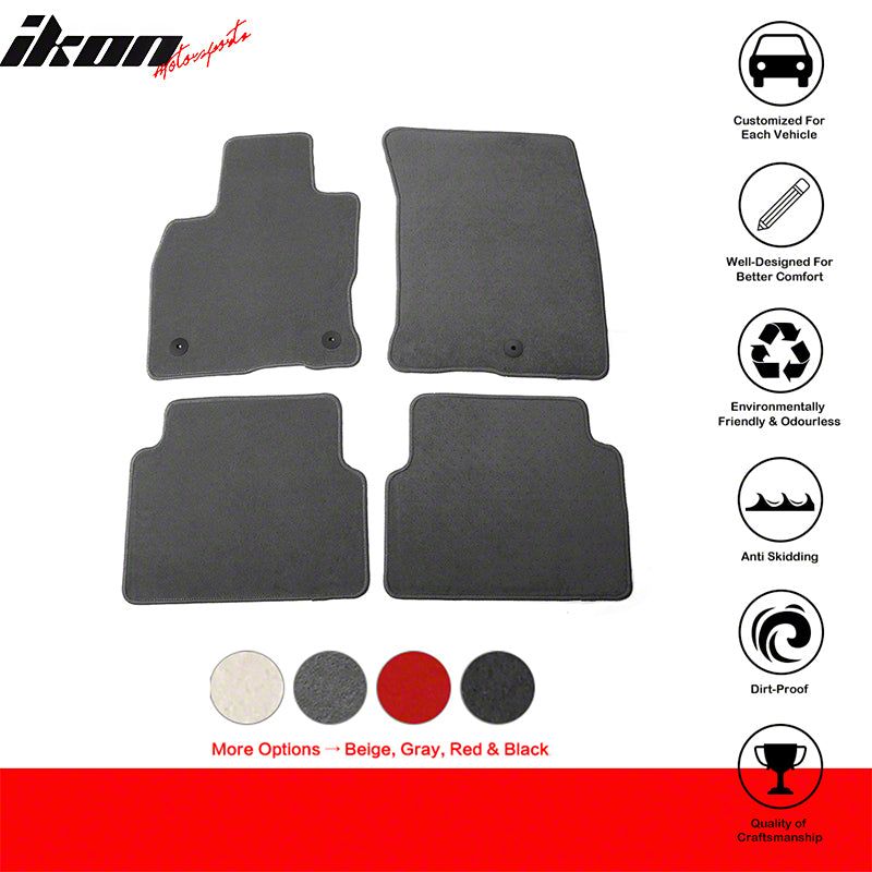 Construction and Appearance. Crafted from durable nylon material, these floor mats feature OEM factory fitment for a precise and secure fit. The nylon fabric combines a dense weave texture that is both resilient and easy to clean. Their neutral gray color complements the vehicle interior while resisting fading and wear over time.