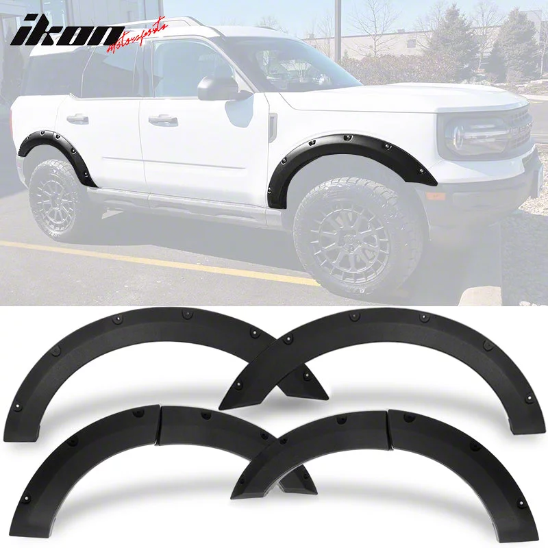 Premium Pocket Style Fender Flares. The Pocket Style Fender Flares Black offer enhanced protection and rugged styling for the exterior of the 21-26 Bronco Sport. These flares shield the wheel wells from debris while providing an aggressive, customized look ideal for off-road enthusiasts or daily drivers seeking added visual impact.