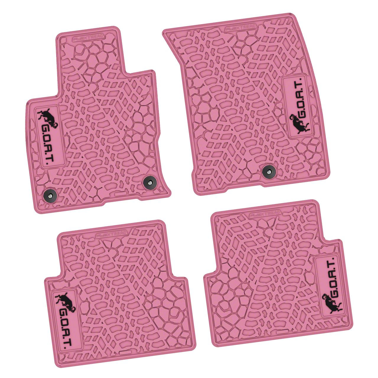 Premium Floor Protection. The Factory Floorpan Fit Tire Tread/Scorched Earth Scene Front and Rear Floor Mats with Black GOAT Insert; Pink provide superior protection for your vehicle's interior by trapping dirt, mud, water, and debris to keep carpets clean. Designed to enhance the interior while delivering functionality, these mats are ideal for everyday use and tough environments where ground conditions vary.