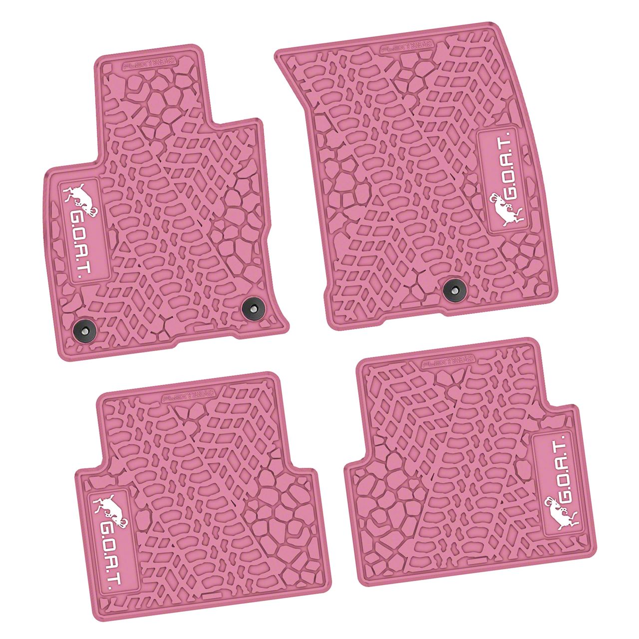 Premium Floor Mat Protection. The Factory Floorpan Fit Tire Tread/Scorched Earth Scene Front and Rear Floor Mats with White GOAT Insert; Pink offer superior protection for your vehicle's interior. Designed to trap dirt, mud, snow, and debris, these mats help keep your vehicle clean and maintain its value while enhancing the interior's aesthetic with a custom look.