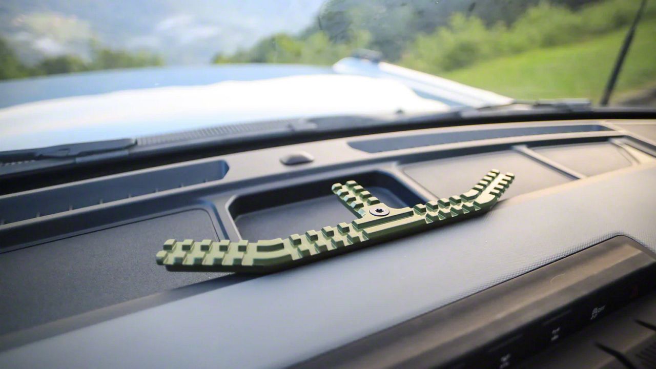 Unparalleled Organizer. Experience unparalleled organization and convenience in your 2021-2025 Ford Bronco with The Slingshot BYOD Dash Rail. Presented in a striking Army Green color, this dash rail not only offers functionality but also adds a touch of rugged aesthetics to your vehicle's interior.