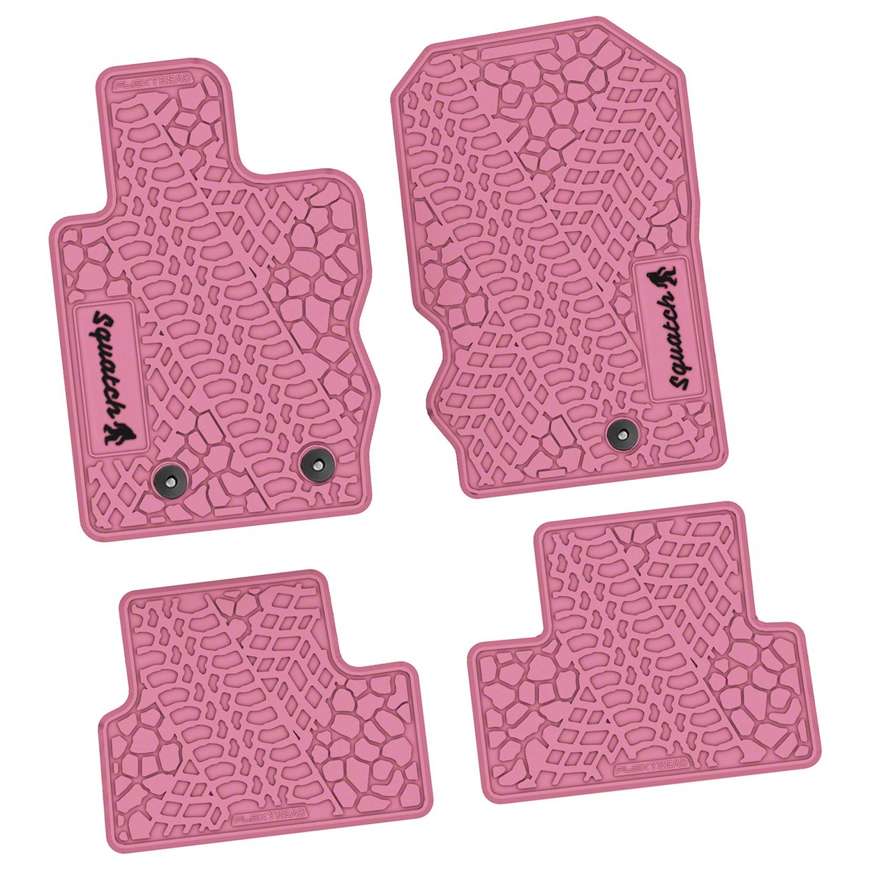Construction and Appearance. Precision-molded to match the exact contours of the 2-door Bronco's floorpan, these mats feature an eye-catching tire tread and scorched earth pattern with pink highlights. A black "Squatch" icon insert adds a distinctive visual statement. Made from heavy-duty all-weather material, the mats resist mud, water, and wear. Deep grooves and raised edges help contain spills and debris, keeping your interior clean.