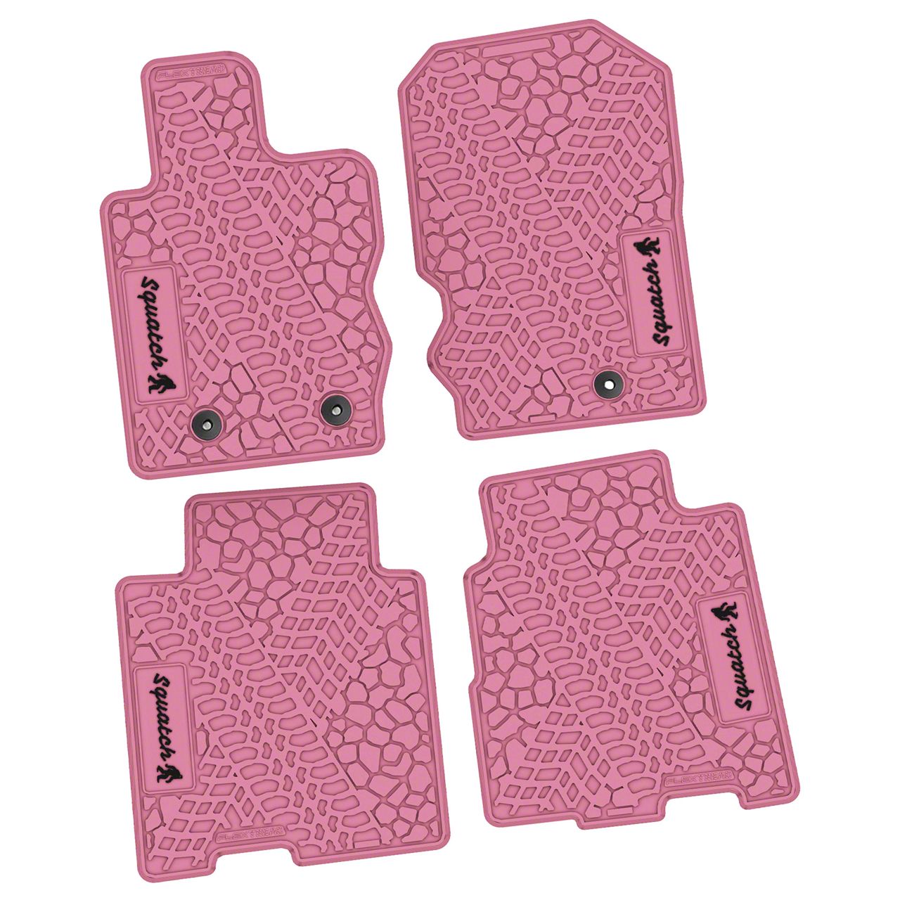 Application. This Factory Floorpan Fit Tire Tread/Scorched Earth Scene Front and Rear Floor Mats with Black Squatch Insert; Pink fits 2021–2026 Bronco 4-door models.