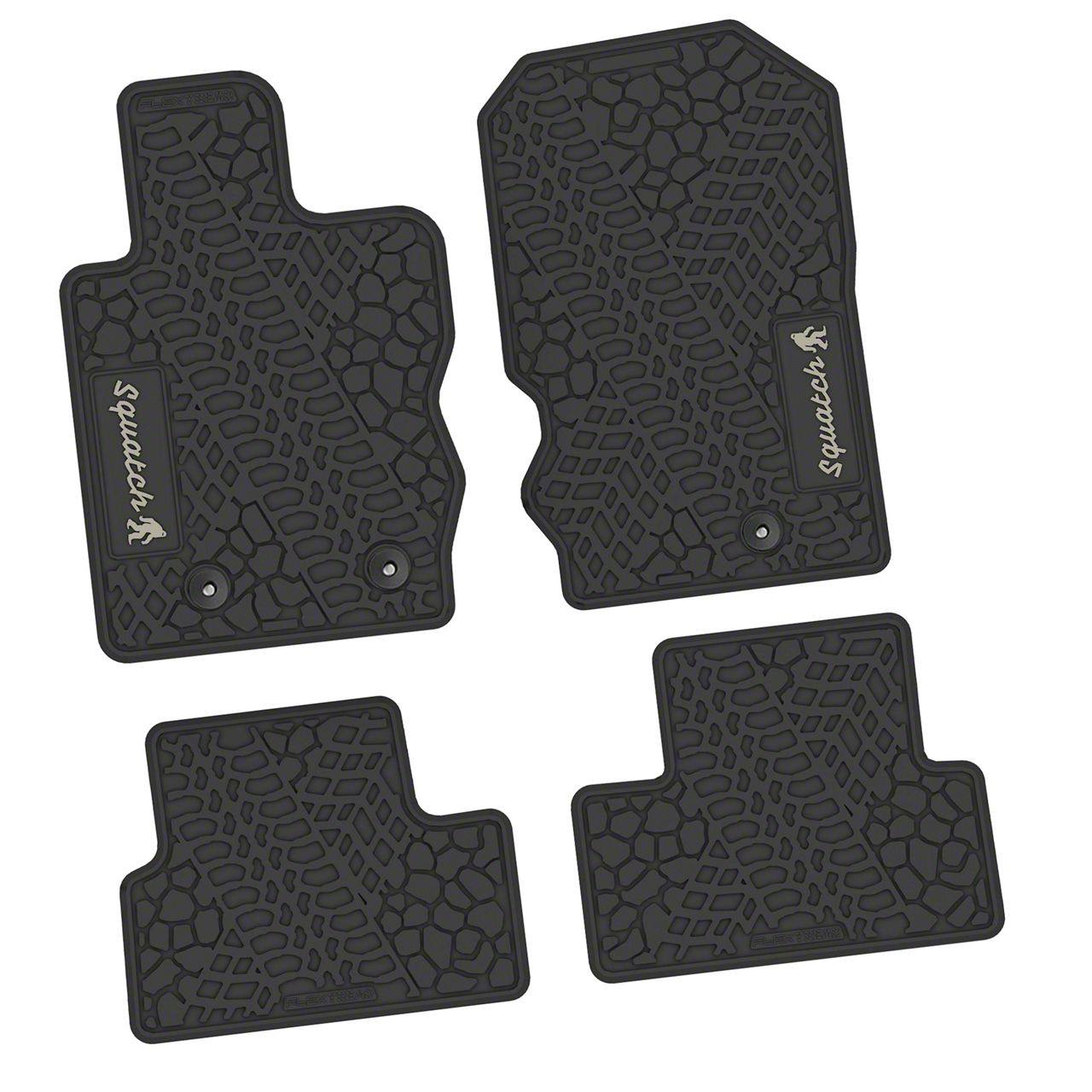 Construction and Appearance. Built from heavy-duty, all-weather material, these mats are designed to endure mud, water, and debris without cracking or warping. The unique tire tread and scorched earth pattern delivers a tough, trail-inspired aesthetic, while the light gray "Squatch" icon insert adds a fun, personalized accent. Raised edges and deep channels effectively trap dirt and spills, keeping your Bronco's interior clean.