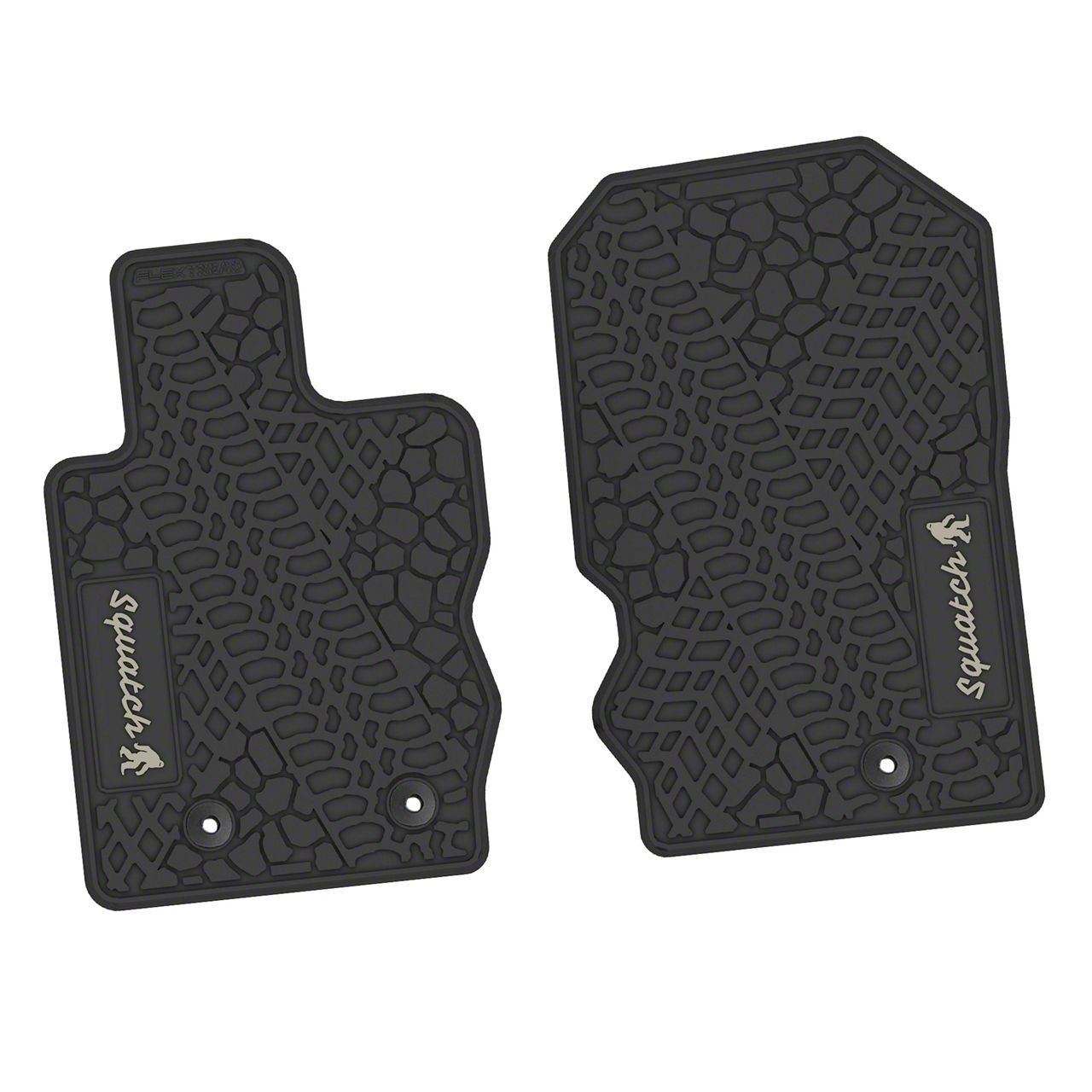 Construction and Appearance. These floor mats are crafted from 100% virgin flexible PVC and feature a matte black finish with a detailed light gray Squatch logo insert. The tire tread and scorched earth pattern not only enhance the aggressive aesthetic but also help trap mud and grime. The sure-grip backing ensures the mats stay in place during extreme use, and each unit is proudly made in the USA to meet high quality and flammability standards (FMVSS302).