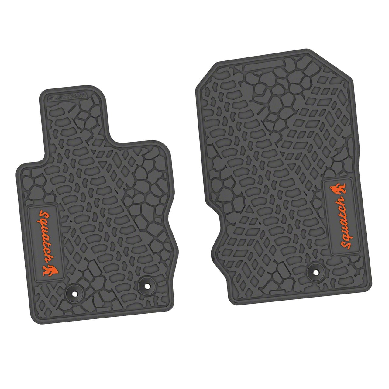 Construction and Appearance. Finished in matte gray with a standout matte orange accent, each mat is molded for a precision stock floorpan fit. Crafted to meet FMVSS302 flammability requirements, they provide a balance of safety and style. The raised tread pattern captures and contains debris, while the anti-skid backing helps lock them in place even during aggressive driving or off-road maneuvers.