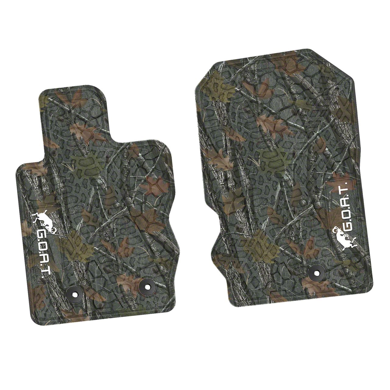 Precision Fit Mats. The Factory Floorpan Fit Tire Tread/Scorched Earth Scene Front Floor Mats with White GOAT Insert; Rugged Woods provide durable protection for vehicle interiors against dirt, mud, snow, and other debris. Designed to perfectly conform to the floorpan, they help maintain a clean and pristine cabin environment while enhancing safety by preventing mat slippage.