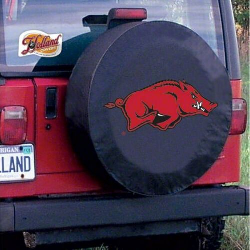 Strong Build Quality. This tire cover is built strong using weather-resistant commercial-grade black vinyl fabric for exceptional durability and style. This cover also features bead-welt seams expertly made utilizing tough stitching for extra tear resistance and a clean look. Additionally, a high-grade elastic band built into its backing helps maintain a snug fit when mounted. Finally, the Arkansas Razorbacks logo is screen-printed using a specialized multi-step technique and UV-resistant inks giving this cover a look that will remain vibrant for years.