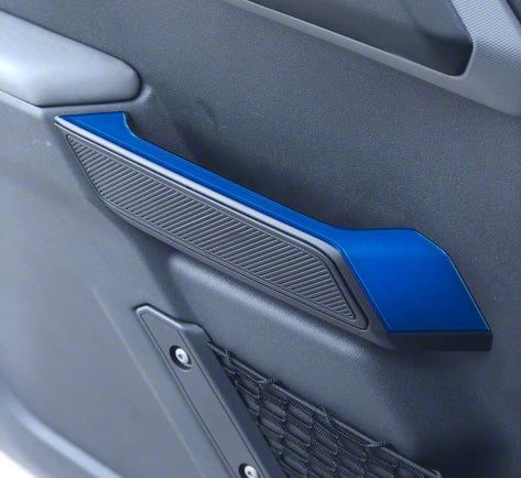 Design. The Upper Front Door Pull Handle Accent Trim adds a dynamic and eye-catching touch to your Bronco's interior. The Velocity Blue color complements the vehicle's design, making it look cohesive and lively. It instantly upgrades the aesthetics of your Bronco's front door handles and adds a personalized touch to the cabin.