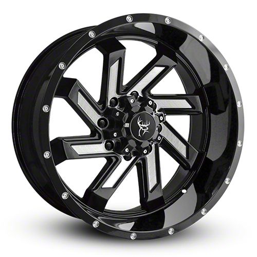 Buck Commander SAW Gloss Black Milled Face Wheel; 20x10; -25mm Offset exudes sophistication with its finish, offering a sleek and modern appeal to any vehicle it adorns. The design is meticulously crafted to enhance the aesthetic of your vehicle, giving it a distinctive and upscale look. Perfect for those seeking to elevate their vehicle's style, this wheel blends seamlessly with both contemporary and classic vehicle designs, making it a versatile choice for a wide range of vehicles. Its robust construction ensures durability, making it a reliable choice for drivers who value both style and quality.