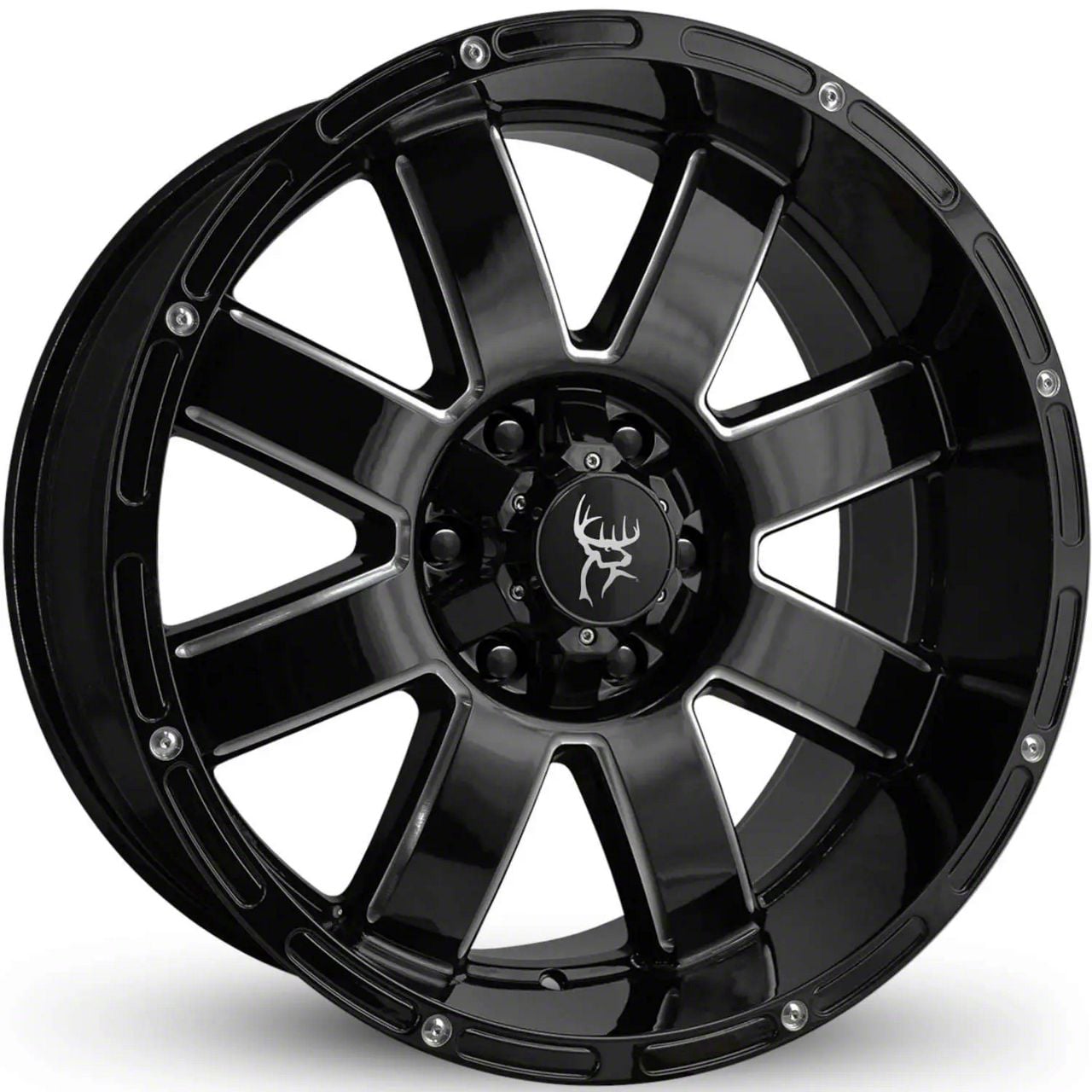 Buck Commander 8 Point Gloss Black Milled Edges 6-Lug Wheel; 20x9; -12mm Offset delivers a bold and modern aesthetic, ideal for enthusiasts seeking a refined yet assertive look for their vehicle. With its standout design and distinct finish, this wheel enhances the vehicle's visual stance and street presence. The precise craftsmanship and premium aluminum build reflect Buck Commander's dedication to quality and distinctive design. Whether parked or in motion, this wheel draws attention with its clean, aggressive styling.