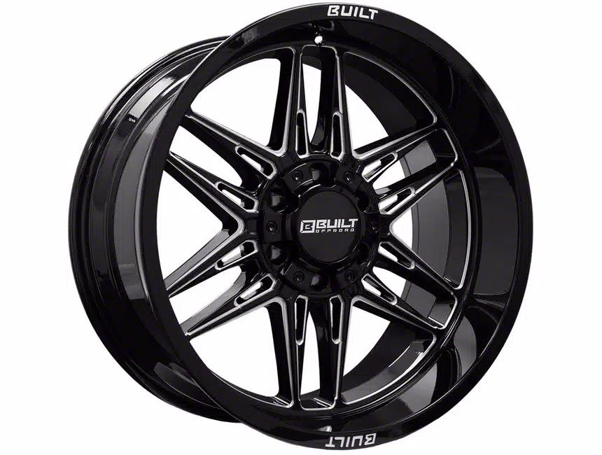 The 20x10 Built Off Road BTO-5 Gloss Black Milled 6-Lug Wheel; 20x10; -19mm Offset is completed in a high quality, gloss black finish. The milled steel accents are where it really shines through. The accents make the split section of the spokes pop along the faux beadlock.
