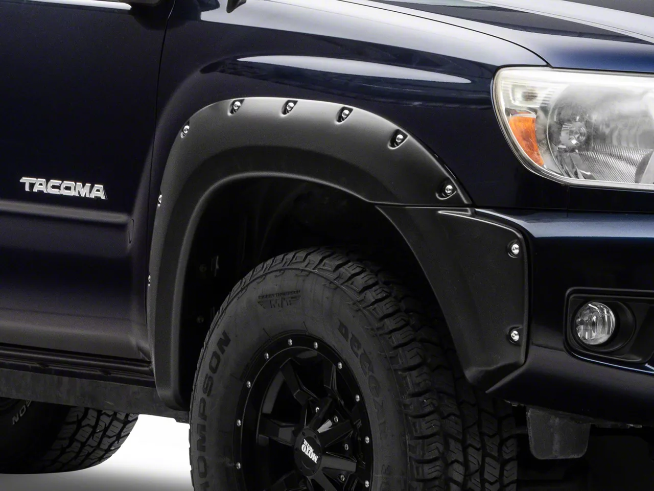 Bushwhacker Delivers. The Bushwacker Pocket Style Fender Flares; Front and Rear; Matte Black delivers aggressive styling for your Toyota Tacoma, sporting a durable Dura-Flex 2000 construction and stainless steel rivets for a true bolt-on style and powerful stance.
