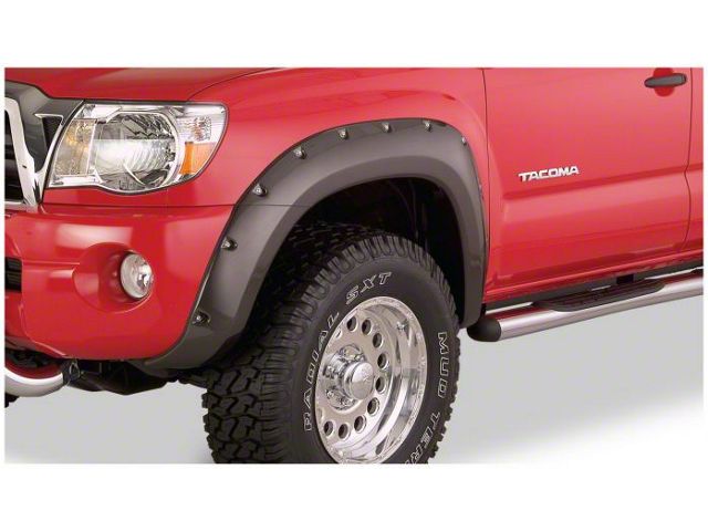 Eye-Catching Accents. Looking for a fender flare that will set your Tacoma apart from the crowd? Then look no further than the Bushwacker Pocket Style Fender Flares; Front; Matte Black. Boasting recessed stainless steel accent bolts, this design is guaranteed to complement your oversized tires and turn heads everywhere you go.