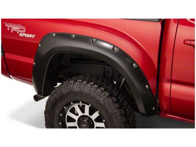 Detailed Accents. The Bushwacker Pocket Style Fender Flares; Rear; Matte Black is built to give your Tacoma a style all its own. Boasting true, off-road styling with recessed stainless steel accent bolts, there’s no doubt these flares will provide a commanding profile. Guaranteed to complement oversized tires or high-lift clearance kits, these flares are sure to turn heads everywhere you go.