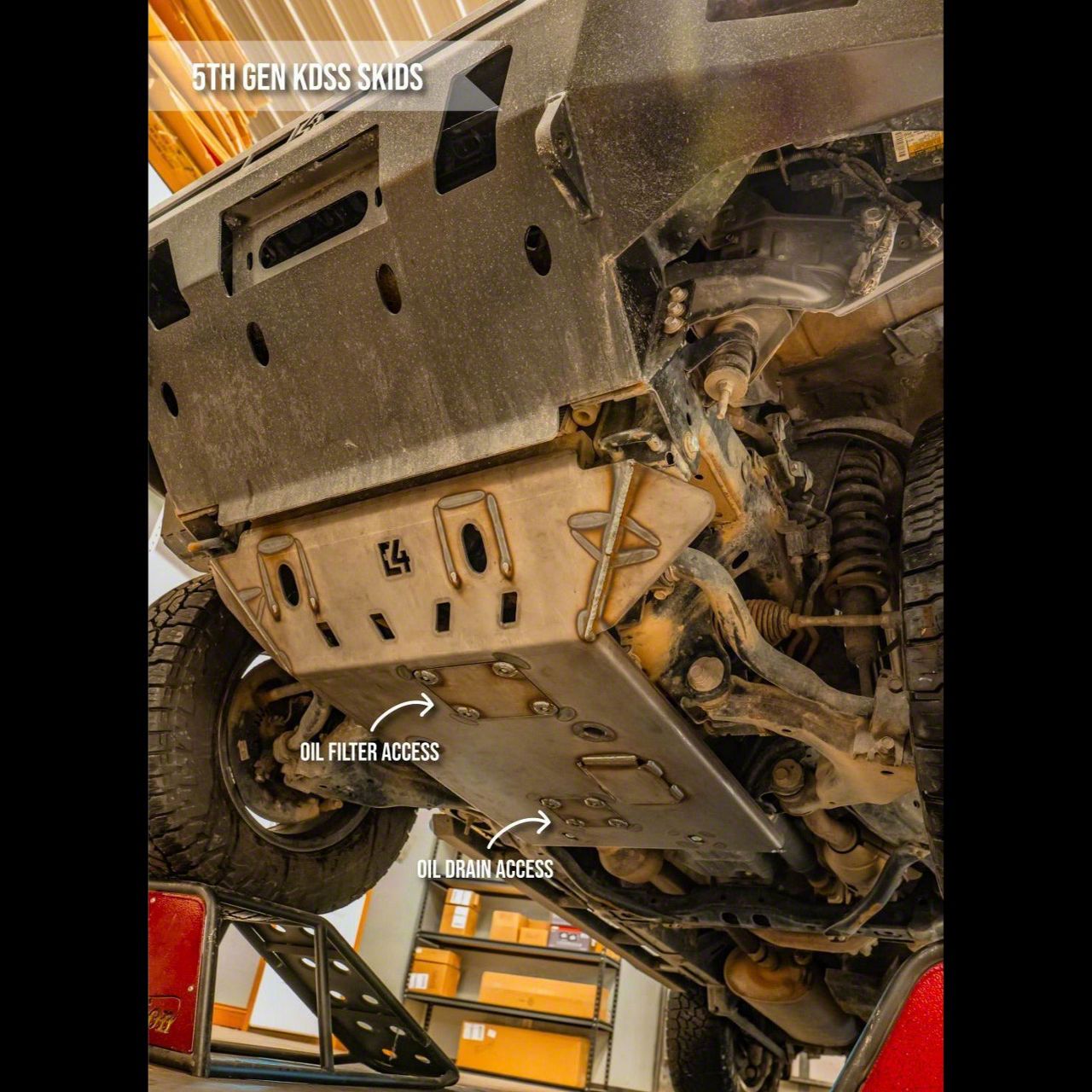 Available for KDSS and Non-KDSS 4RunnersWide coverage to help protect vital engine componentsThree separate skid plates that bolt together to protect the engine, transmission, and transfer caseUnique bolt-in crossmember helps maximize strength and protection for the transfer caseMade from 3/16" CNC cut P&O steel100% Bolt-On designOil Drain and Oil Filter Covers allow for easy oil changes without removing the skid platesWorks with 1" diff dropWorks with most aftermarket bumpersSet weighs 136lbAll mounting hardware includedIncludes front and rear skid platesAvailable in steel onlyUnless you choose our powder coated option, this product will need to be painted or powder coated before installation to prevent rust