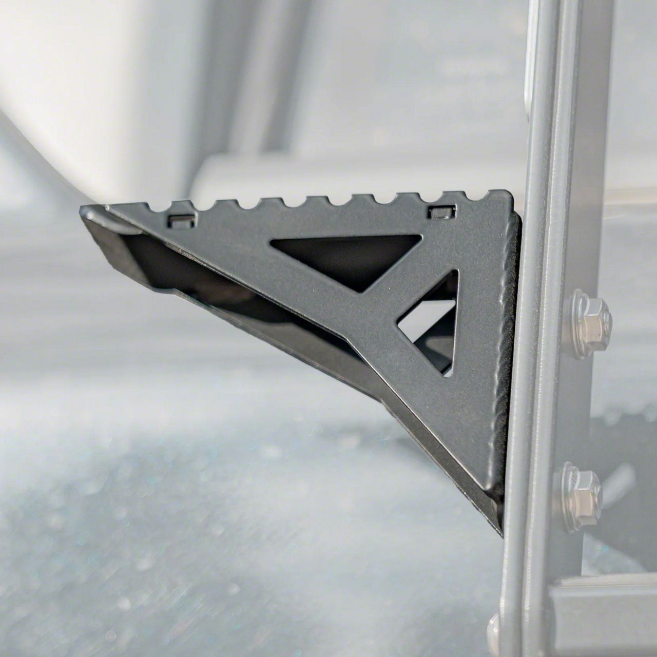Enhanced Ladder Utility. The C4 Fabrication Summit Hatch Ladder Side Step in black is an add-on designed to increase the functionality of your existing Summit Hatch Ladder by providing extra foothold points. This addition improves access and ease of use, especially when ladder steps are obstructed by mounted accessories or cargo, making climbing safer and more convenient.