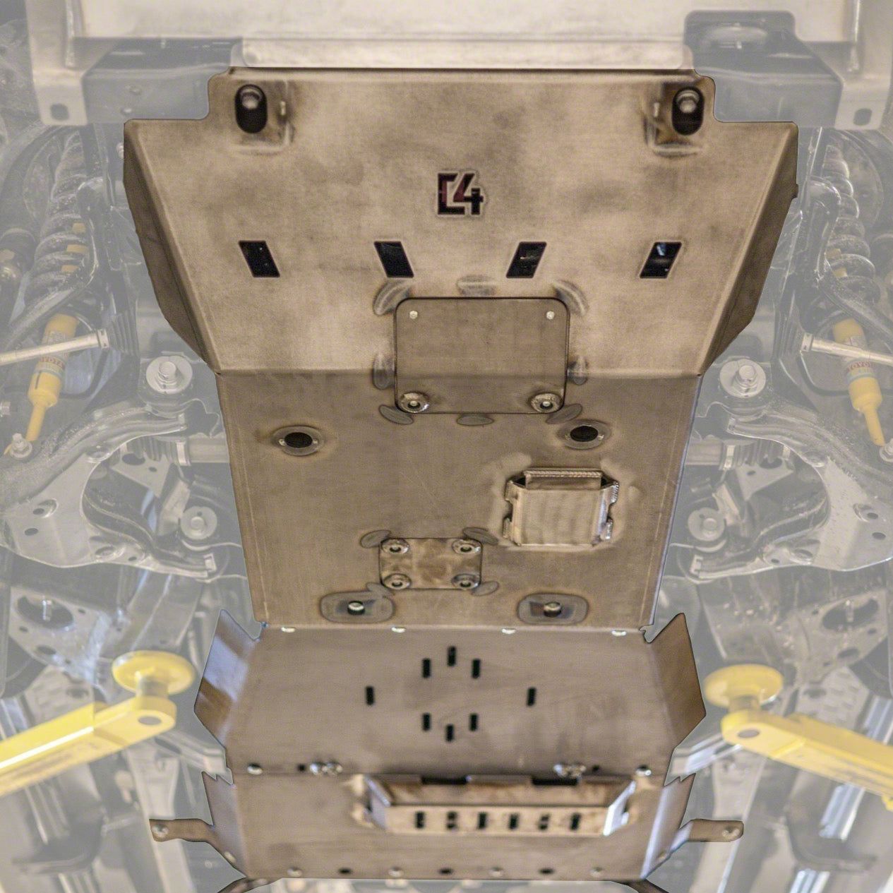 Wide coverage to help protect vital engine componentsThree separate skid plates that bolt together to protect the engine, transmission, and transfer caseAvailable without the exhaust clearance drop for Tacomas with exhaust reroute (flat fill plate will be welded in place)Unique bolt-in crossmember helps maximize strength and protection for the transfer caseMade from 3/16" CNC cut steel100% Bolt-On designOil Drain and Oil Filter Covers allow for easy oil changes without removing the skid platesWorks with 1" diff dropWorks with most aftermarket bumpersWeighs 158lbAll mounting hardware includedIncludes front and rear skid platesAvailable in steel onlyUnless you choose our powder coated option, this product will need to be painted or powder coated before installation to prevent rust