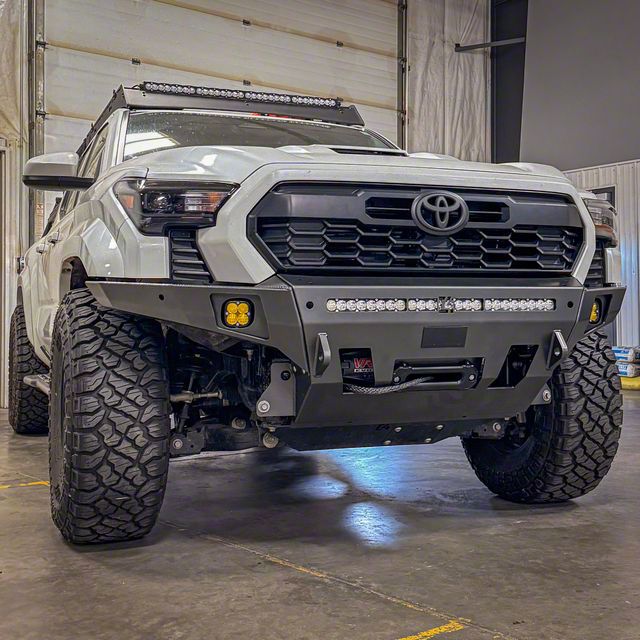 Requires cutting of the plastic bumper to install.Fits most winches 8k-12k in size. Electrical control box must be relocated from top of winch and trimming/fitting will be required (Warn VR series is a confirmed fit).We recommend using winches with synthetic rope and a hawse style fairlead for the best fitment and functionality. Some roller fairleads may be too large to fit the recessed fairlead mounting plate in the bumper.Cutouts in front of bumper allow winch lever access.Bumper is designed to fit 30″ single row light bars (specifically designed for Baja Designs S8, Heretic Studio 30" and Rigid SR-30 light bars.Fog light pockets designed for Baja Designs Squadron lights. (Factory fog lights not supported)Bumper is made from 3/16″ laser cut P&O steel.Tubing for bull bars is all 1 3/4" OD, 1/8" wall thickness except for gussets and headlight hoops which are 1 1/2" OD.3/4″ thick D-ring tabs fully welded front and back come standard.114 lbs without bull bar, 121 lbs with low-height bull bar, 128 lbs with mid-height bull bar with tube gussets, 138 lbs with full height bull bar and headlight hoops.All bull bar variants are compatible with Toyota Safety Sense and parking sensors. Be aware that some vehicles will randomly require a professional TSS system recalibration after bumper install.Unless you choose our powder coated option, this product will need to be painted or powder coated before installation to prevent rustIncludes Washer Tank Skid and winch controller relocation kit.TRD Pro and TRD Off-Road models do not require additional mini-skid panel.This product ships Ground.