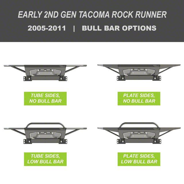 If you select cross member delete you will be required to cut out the factory cross member and replace it with ours.Click HERE for cross member delete/skid infoIf you opt for the cross member delete, you will receive a replacement cross member, rock runner front skid plate, and power steering relocation kit.Weights: Front w/ Plate Sides: 85 lbs, Front w/ Tube Sides: 85 lbs. Bull bar adds 5 lbs.Frame support brackets are INCLUDED with bumperModular, 3-piece design utilizing bolt-on wingsBumpers ship with winch cover plate and bridge skid that will connect to our current skid plates and factory cross member.Fits most winches 8k-10k in size. Winches with the ability to relocate the electrical control box are recommended. Integrated control box winches may require some trimming of the grille support brackets to fit. (Smittybilt X20, Warn VR series are both common winches that fit).We recommend using winches with synthetic rope and a hawse style fairlead for the best fitment and functionality. Some roller fairleads may be too large to fit the recessed fairlead mounting plate in the bumper.Cutouts in front of bumper allow winch lever access.Bumper is made from 11ga laser cut P&O steel with 3/16" thick mounting plates and winch plate.3/4″ thick D-ring tabs fully welded front and back come standard.Additional Front Bumper Frame Support Brackets included with all 2nd Gen Tacoma Rock Runner front bumpers! ($177.00 value).Bull bar not compatible with Toyota Safety Sense.Unless you choose our powder coated option, this product will need to be painted or powder coated before installation to prevent rust