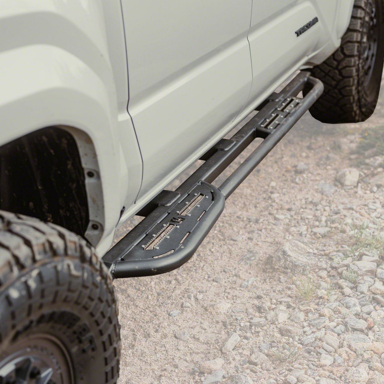 Construction and Appearance. Manufactured from heavy-duty, reinforced tubing, these rock sliders are built to withstand harsh off-road environments. The black powder-coat finish adds a layer of corrosion resistance while giving your vehicle a rugged, aggressive look. Integrated stainless steel step plates not only enhance functionality but are crafted to prevent buildup of mud and snow, ensuring optimal traction in all conditions.