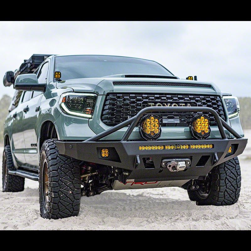 Overland Protection Upgrade. For 2014-2021 Toyota Tundra models, the C4 Fabrication Overland Series Bumper provides rugged front-end defense with a matte black finish powder coating and a full-height bull bar featuring tube gussets for extra strength. Engineered for off-road enthusiasts, this bumper includes a 30-inch light bar cutout for use with Baja Designs S8, RIGID SR Series, and Extreme LED 5D 30-inch light bars, giving you enhanced visibility and aggressive styling in one package. Its versatile, bolt-on design and winch compatibility ensure your vehicle is ready for any adventure.