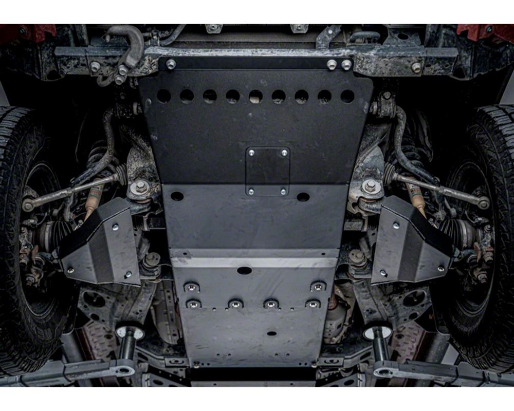 High Strength Build Quality. The individual skid plates included with this set are made from high-grade 3/16th-inch thick steel plate for maximum strength. Moreover, these skid plates are precision-cut and machine-formed to exact measurements, offering a tight fit when installed. Finally, these skid plates receive a protective black powder coat finish for exceptional protection against rust and corrosion.