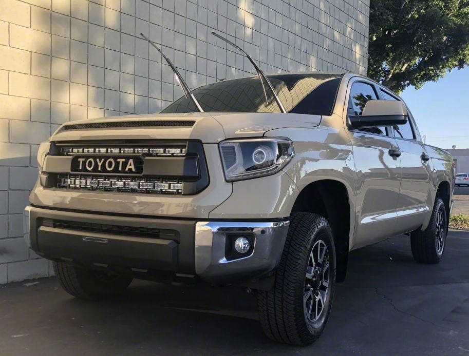 Application. The Cali Raised LED Dual 42-Inch Curved LED Light Bars with Hidden Grille Mounting Brackets - Spot Beam is compatible with the 2014-2021 Toyota Tundra.