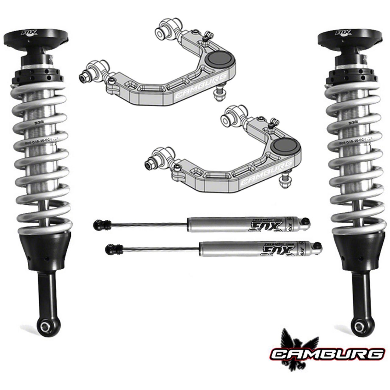 Construction and Appearance. The kit features FOX 2.5 Factory Series IFP coil-overs with a smooth-bore, zinc-plated, honed seamless alloy body, and black anodized 6061-T6 billet aluminum components. The 7/8" hard chrome-plated, heat-treated alloy steel shaft ensures durability. The FOX 2.0 Performance Series rear shocks have a larger aluminum body for better heat dissipation and performance. Camburg's upper control arms are constructed to correct suspension geometry and improve alignment.