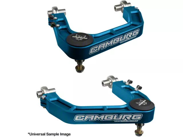 Enhanced Performance Control Arms. The Camburg KINETIK Series V2 Performance Billet Uniball Front Upper Control Arms are engineered to provide superior handling and increased wheel travel for off-road and on-road conditions. Designed to correct camber and caster while eliminating the weak factory ball-joints, these control arms offer a modern design with enhanced durability and aesthetics.