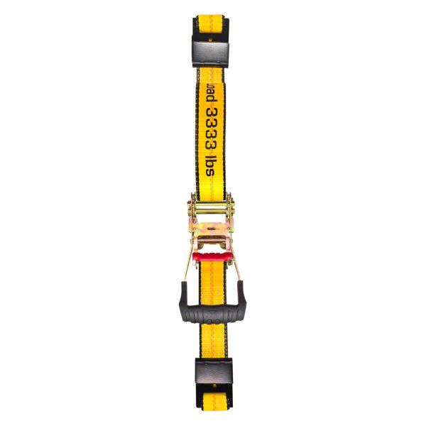 The high visibility yellow strap is constructed of heavy-duty polyester webbing that resists stretching, tearing and rot. The burly steel flat hooks are rubber coated and won’t bend and offer added security when latched to equipment, trailers and vehicles. And the hardware is zinc coated to fend off corrosion.