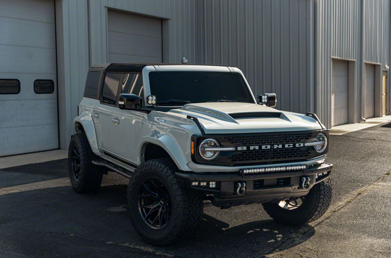 Bold Hood Upgrade. The Cervini's Stalker Hood is designed to bring an aggressive new profile and functional airflow improvement to your 2021-2026 Ford Bronco. With a large center scoop and included CNC aluminum screen, this hood not only enhances your Bronco’s front-end appearance but also boosts underhood ventilation for improved thermal performance.