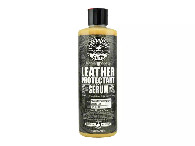 Keep Your Leather Looking Fresh. Keep your leather looking fresh for years with this Chemical Guys Leather Serum Protectant; 16-Ounce Bottle. Any leather components in your vehicle can get cracked or faded over time, especially if you live somewhere prone to hot weather. Not to mention, oils, chemicals, moisture from your hands, or even hair products are not exactly leather-friendly and can affect their quality over time. This leather protectant protects interior leather surfaces from contaminants and UV rays, ensuring they remain looking fresh for years. What’s more, this leather serum protectant does not leave a greasy feel when applied.