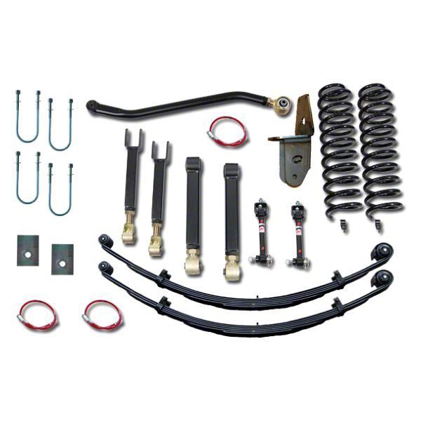 Construction and Appearance. This lift kit features adjustable upper and lower control arms and a heavy-duty track bar that are built for durability. The military wrap full leaf springs ensure strength and longevity. The kit includes DOT approved stainless steel brakelines, adding a touch of refinement with both safety and style in mind.