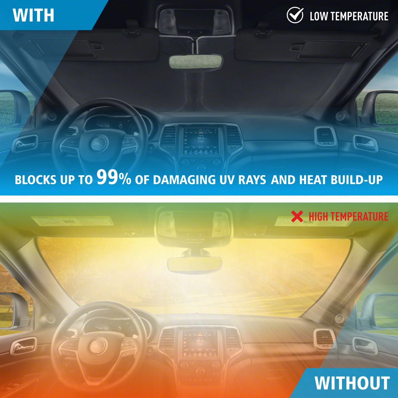 Added UV Protection. The Windshield Sun Shade is expertly crafted to provide maximum coverage and efficiency in blocking out the sun's rays for your Jeep Grand Cherokee WK2. Made from high-quality materials, this sun shade is built to last and withstand the rigors of daily use. It effectively reflects sunlight, reducing heat build-up inside the vehicle, and keeps the interior cooler, providing a more comfortable driving experience.