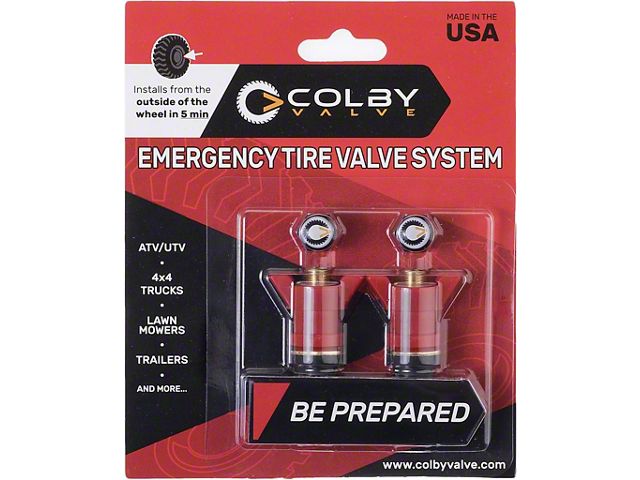 Design. These Colby Valve Emergency Tire Valves are extremely apparent even in low light thanks to their brilliant red hue. This not only increases the safety of your vehicle but also makes it simple to find and open the valve when you need it most.