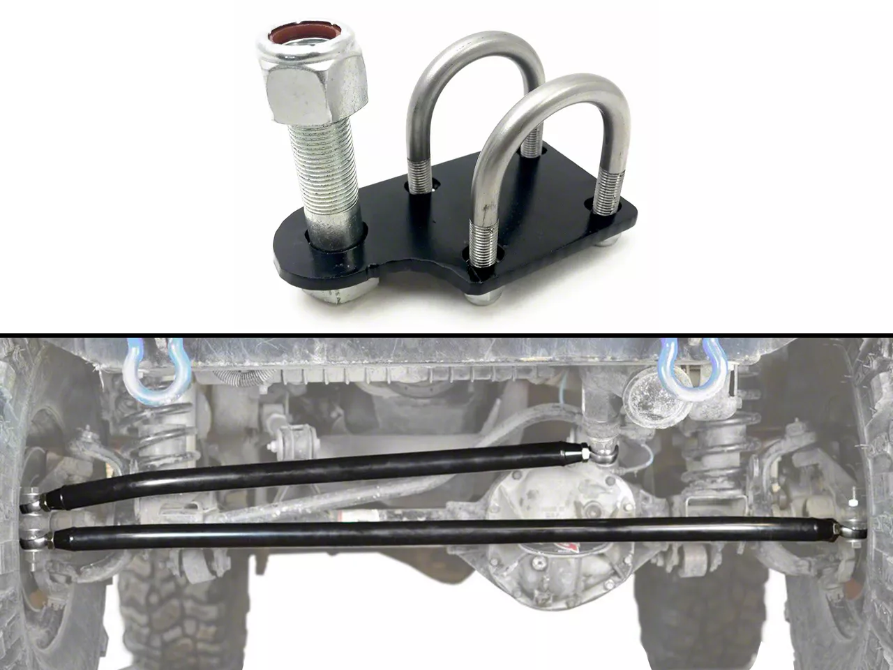 Steinjager 1.50-Inch Steering Stabilizer Mount. The Steinjager steering stabilizer bracket kit is designed to fit 1.5-inch O.D. tubing. It is manufactured from 3/16-inch steel with a 5/8-inch mounting hole and is powder coated black. Kit Contents (1) Universal Flat Steering Stabilizer Bracket, (2) Stainless Steel U-bolts, (4) lock nuts, (1) 5/8" mounting bolt with washer and lock nut.