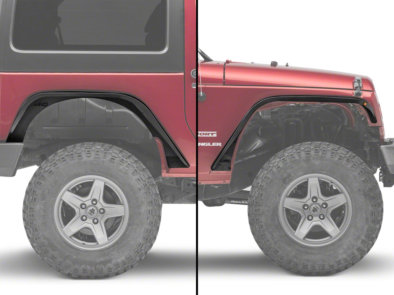 Application. These Jeep Licensed by RedRock Slim Fender Flares with Jeep Logo; Front and Rear are specifically designed to fit 2007-2018 Jeep Wrangler JK models.