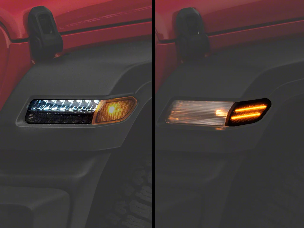Exterior Lighting Upgrade. Raxiom's Axial Series LED Fender Flare Marker Lights and Sequential LED Parking/Turn Signal Light Combo Kit is a simple and effective way to upgrade the exterior styling of your 2018-2026 Jeep Wrangler. The Side Marker Lights feature two razor sharp LED strips that replace the unsightly hot spot of the factory lights. While the Parking/Turn Signal Lights feature highly visible amber LEDs that sequence when activated. These Raxiom Axial Series Lights not only look great, but are much brighter than the weak factory incandescent lights for increased visibility day or night.