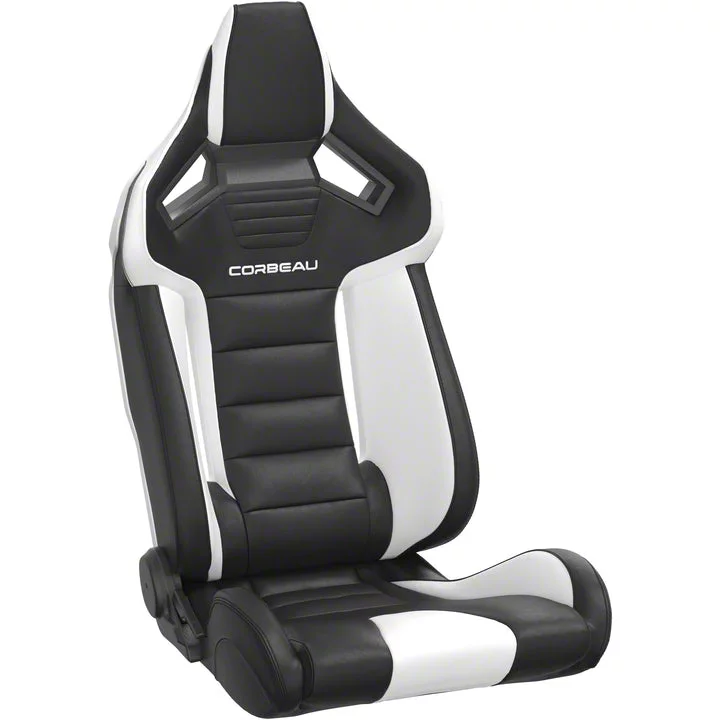 Design. The Corbeau FXR Reclining Seats showcase a striking black and white vinyl cover that perfectly complements any vehicle interior with its bold, two-tone design. This chic and stylish pattern not only adds a layer of sophistication to your interior but also boosts its overall aesthetic appeal, making it a standout feature. The accompanying sleek white FRP shell enhances this effect by providing a modern and upscale look, which contrasts beautifully with the black and white vinyl. This combination delivers a sophisticated, racing-inspired appearance that is bound to impress both passengers and onlookers alike, reflecting a luxe, sporty vibe that elevates the interior to a higher standard of style.