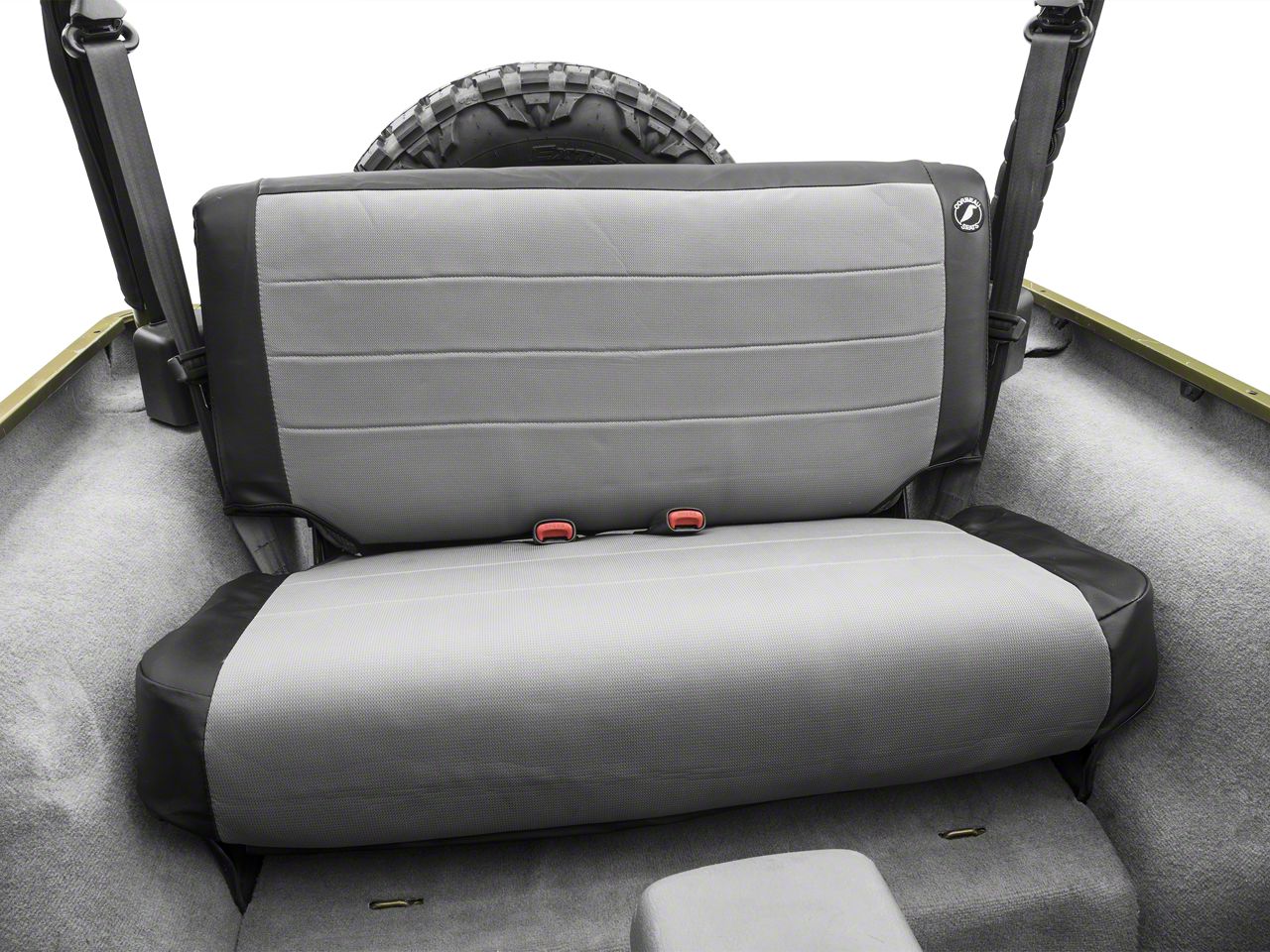 Give Your Ragged Seat New Threads. Sometimes accidents, such as spills, happen and your Jeep’s rear seat might have beverage and food stains. If the bench seat in the back of your Jeep Wrangler TJ has grown worn from every day wear-and-tear or has been damaged, there is no need to replace the whole seat. You can easily fit the Corbeau Rear Seat Cover in Black Vinyl & Gray Cloth over the back seat and restore your Jeep's seats seats into an original fresh finish and look.