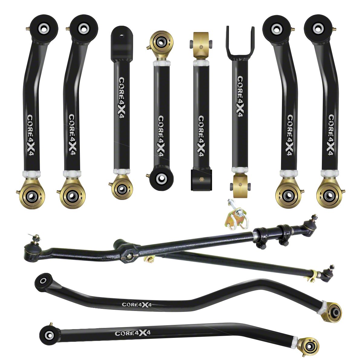 Complete Suspension Solution. The Core 4x4 Camp Series Adjustable Upper And Lower Control Arm, Track Bar And Currectlync Kit delivers all-around performance upgrades for serious off-roaders. This all-in-one kit offers a complete set of components to elevate control, flexibility, and strength across a variety of driving conditions. It ensures precise alignment and improved maneuverability whether you're conquering trails or navigating daily terrain.