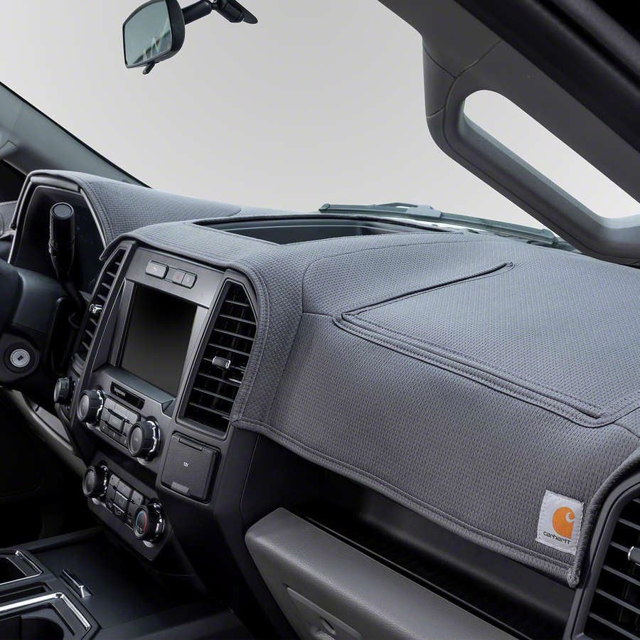 Construction and Appearance. This dash cover is crafted with precision for a custom fit that ensures full coverage and seamless integration. The Carhartt Gravel finish adds a tough, industrial aesthetic, while its durable construction shields your dashboard from UV rays, wear, and blemishes, maintaining its pristine appearance.